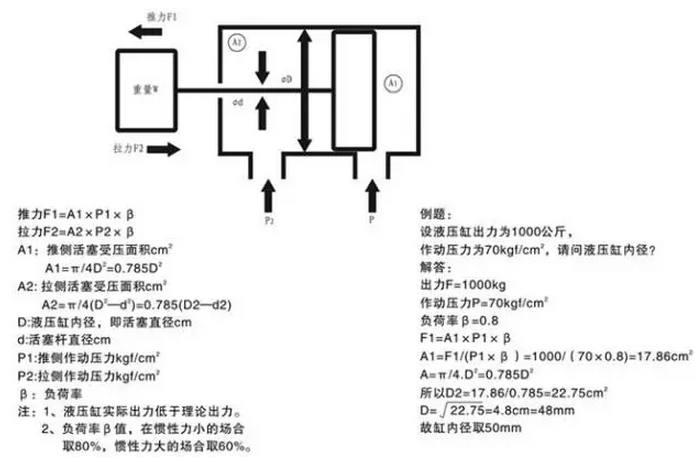 選擇好設計壓力后,即P可知的,負載大小F又是可知的,則用公式得出S受力面積,再根據受力面積計算出油缸的缸徑。